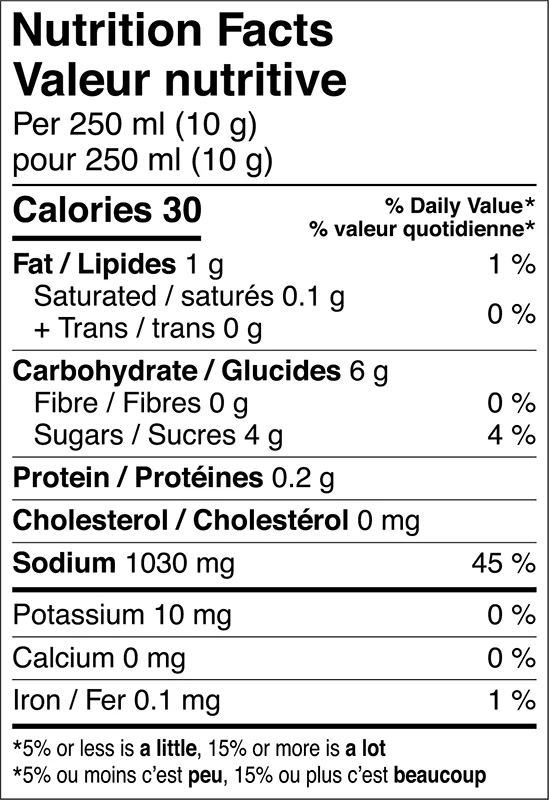 Dextrose, Salt, Corn Flour, Vegetable Oil (Canola), Onion Powder, Spices (Turmeric, Celery, Pepper), Monosodium Glutamate, Silicon Dioxide, Natural Flavours (Yeast Extract, Maltodextrin, Salt, Calcium Silicate), Hydrolyzed Corn Protein (Corn, Sunflower Oil).
